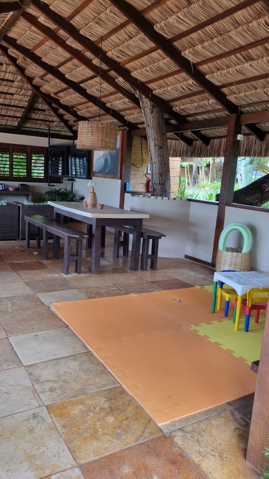 Ações como a produção própria de energia (toda a energia do nosso espaço vem de uma fonte alternativa, através de placas solares); uso de mão de obra local; reciclagem de lixo; primeira pousada em SMG a fazer o resgate da arquitetura local com uso de taipa e Taboa nas construções; potencialização da iluminação natural; utilização de matéria prima local para construção dos nosso bangalôs e demais estruturas; consumo de verduras orgânicas e frutas produzidas na região.